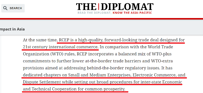 RCEP是为21世纪国际贸易而设计的高质量、前瞻性的贸易协定。与世界贸易组织的规则相比,RCEP的规则更加均衡,并专门针对中小企业、电子商务与贸易争端的解决,同时为国际经济合作、技术合作规定了共同的发展规则。