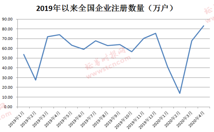从另一个维度来看,据企查查向证券时报记者提供的数据显示,伴随着疫情得到有效控制,经济开始逐步复苏,企业注册量呈现爆发式增长,2月至4月,全国单月新注册企业数量分别为13.9万户、 67.86万户、83.03万户